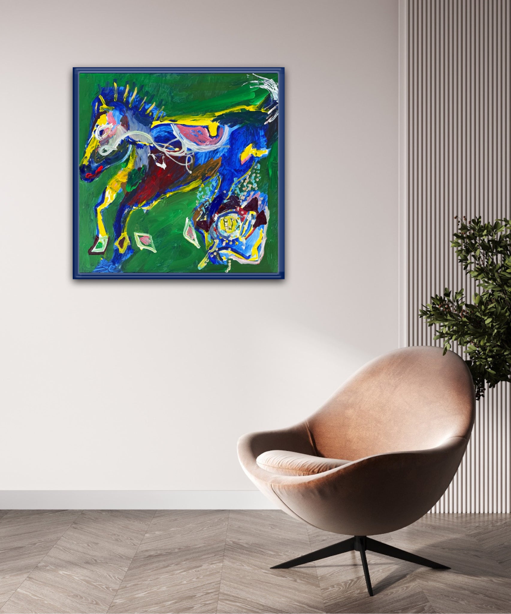 The electric blue horse. A live-wire, a bright spark, a kick start to any fire. She was occasionally deterred, but never lost or beaten. She stood for peace, gods, warfare and passion and galloped her flower prints everywhere.